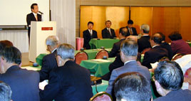 平成15年1月20日(月)に滋賀県生活衛生営業経営相談員会(藤塚会長)の新年研修会が近江八幡市の「ホテルニューオウミ」で開催され、経営相談員ら58名が出席しました。 |