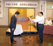 平成20年(2008年)6月19日、大津市のロイヤルオークホテルにおいて、社団法人滋賀県生活衛生協会主催の生衛大会が開催されました。当日は、上野県議会議長、衆議院議員の川端協会顧問、岩永協会顧問(代理)、県議会議員の三浦協会顧問、蔦田(つただ)協会顧問、滋賀県から健康福祉部の漣(さざなみ)部長、生活衛生課の山中課長、県食品衛生協会から西村会長、国民生活金融公庫から芝野大津支店長と斉藤彦根支店長をはじめ、多くの来賓の出席をいただき、また、各生活衛生同業組合からは正副理事長ら幹部が出席しました。大会では、本年度の滋賀県知事表彰、生衛協会理事長表彰が実施された後、本年度の生衛大会活動方針ならびに当指導センターや各生衛組合の活動方針が発表され、最後に、平成20年度の生衛業界共通スローガンの採択と「K4deECO(ケイヨンデイコー)」運動の実施宣言があり、盛会裏に終了しました。 |