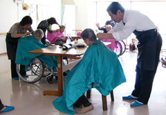 栗東市商工会が実施されております福祉事業に地元の理容師さんや美容師さんが積極的に参加されております。さる平成20年(2008年)11月4日には、栗東市の特別擁護老人ホーム「淡海荘」で入所者へのカットの奉仕活動をされました。当センターは本年度も地域生活支援事業の一環として、経営相談員会草津支部(宮城豊治郎支部長)を通じてこの活動に協力いたしました。 |